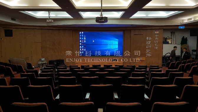 為提升投影效果讓演講者內容多元化的呈現,汰換使用多年的布幕改以COB LED16:9顯示器提供160"可視範圍,配合EXTRON HDMI 4K矩陣切換使用並於主席演講桌上提供支援4K訊號的輸入面板(HDMI& VGA),讓演講者可以在設備汰換的過渡時期,依舊可使用原有訊號格式傳送演講訊息,新系統的上線也整合客戶原有的音訊系統,如此影音畫面才能完美呈現。